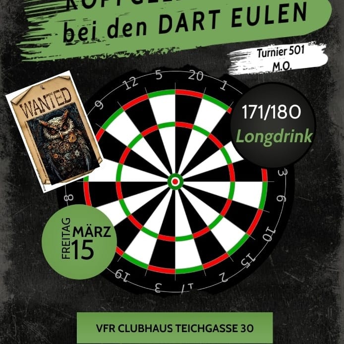 Am 15.03.24 laden die Dart Eulen wieder alle Freunde zum Koppgeld-Kratzerle ein….Feuer frei !!