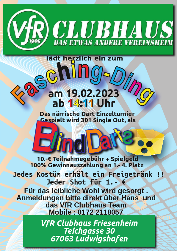 De Hans lossts krache.... Als Ersatz für den ausfallenden Umzug in LU / MA bietet uns der VfR ein scheenes närrisches Dart Einzelturnier. Also…Feuer frei… Good Darts und A-Hoi 🙂
